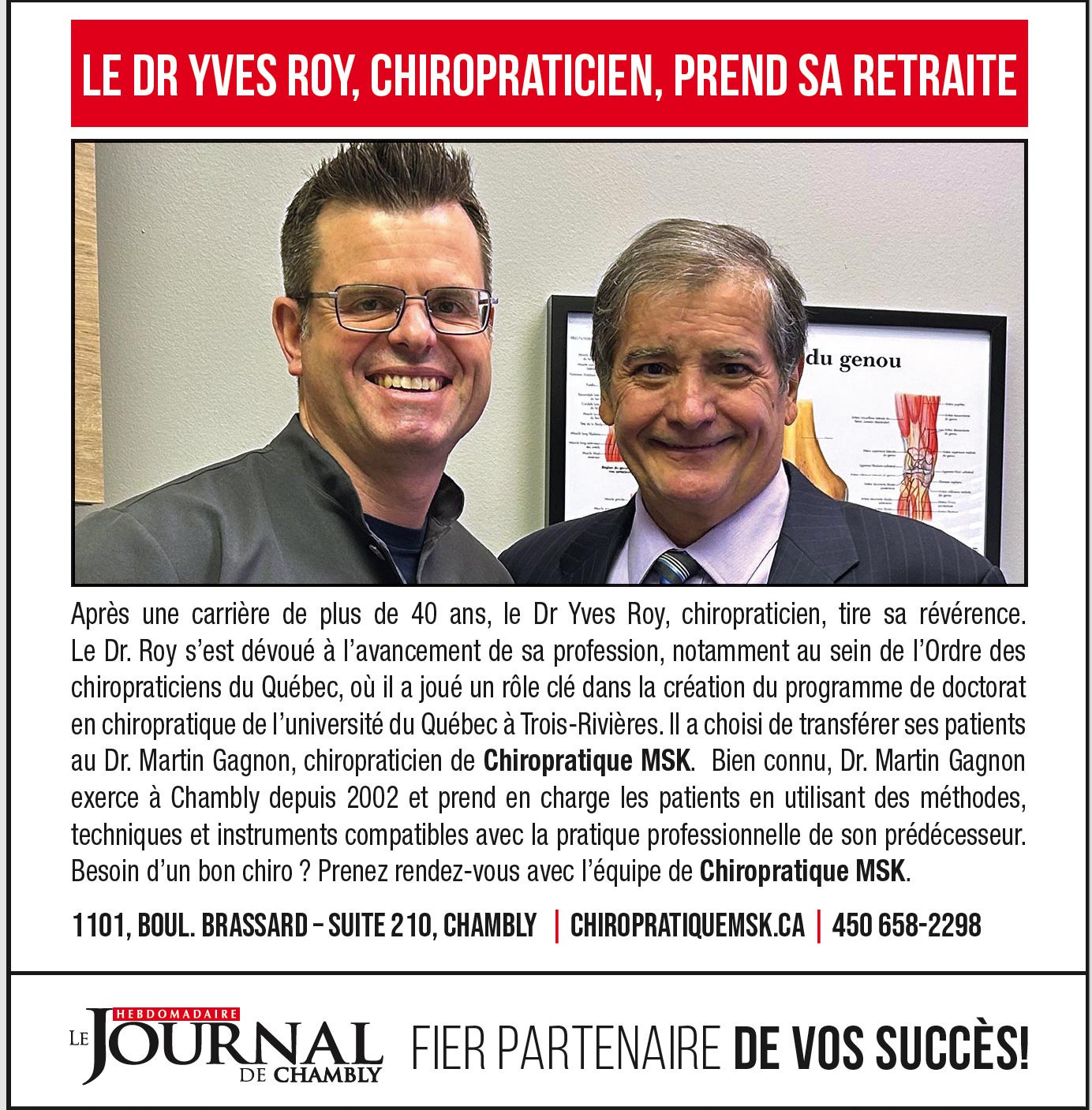 Avec sa retraite bien méritée, le Dr Yves Roy conclut une carrière marquée par la confiance et la fidélité de ses patients. Nous saluons son dévouement, son expertise et son humanité, et lui souhaitons une retraite paisible, avec la gratitude de tous ceux dont la vie a été touchée par ses soins.